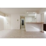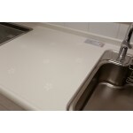 高級感のあるキッチンにするために、床やキッチンパネルなどを白を基調としてリフォームしました。キッチン前面・側面の既存の白いキッチンタイルを使えるように、キッチンの形は変えずに同じ壁付けI型で交換をしました。ワークトップは花柄の人工大理石で、汚れがついてもメラミンスポンジでさっと拭くだけできれいになり清掃性にも優れています。キッチンリフォームに合わせて照明も、ダウンライトに変えることで、ホテルライクなリビング・ダイニングとも合う、雰囲気のある素敵なキッチンとなりました。