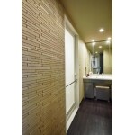 (旧東京ガスリモデリング株式会社での事例です。)洗面室はちょっとしたアクセントがあると雰囲気が大きく変わります。アクセントとして、壁の一部にタイルをご提案。素材感のあるタイルは照明により陰影を創出し、豊かな雰囲気が実現しました。洗面化粧台は既存です。