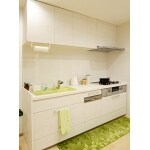 (旧株式会社ハウスドゥでの事例です。)リビングの壁の珪藻土の色と合わせて緑色のシンクをご選定、LDKが統一感のある空間に。