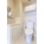 ガラス製の貝殻のような光沢のあるモザイクタイルで壁の一部をデコレート、オプションで鏡とガラス棚を取付ました。