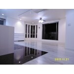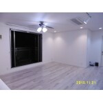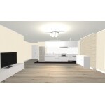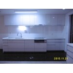 L型キッチンをサイズ変更するより、I型にレイアウト変更をご提案しました。壁面に収納・キッチン・冷蔵庫を並べて配置し、残りは家具のアレンジ次第でお好みのスペースにご利用いただけます。このプランの難点は、キッチンのご利用状況がLDから見えてしまう事ですが、奥様はとても整理上手でいらしゃるので、安心してお勧めできました。 また、キッチン本体とカウンター収納は同じメーカーの商品で扉の色柄も同一ですが、サイドパネルなどの収まりの違いがあったため、シリーズ違いでご案内しています。
