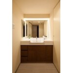 (旧東京ガスリモデリング株式会社での事例です。)下部のキャビネットと鏡は既存のものを活用し、カウンターのみ新設し、造作により新しい洗面が完成しました。奥さまがメイクもできるように優しい色合いのLED照明をご提案しています。