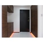 玄関収納の下部にLEDライトを設置し、足元を明るく見えやすくいたしました。このライトはスマートフォン等からの設定で、いつもで好きな色(選択可能は色は約1600万色)に変更することができます。 また、収納棚に関しても、靴はもちろん、大き目の物を収納できる棚を設置させて頂きました。