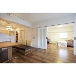 リビングに隣接する和室を洋室に変更し、扉を開け放つことで空間に開放感を創出。一角には書斎コーナーも設置しました。