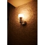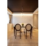 (旧東京ガスリモデリング株式会社での事例です。)空間にメリハリがつくよう、ダイニングの天井には木目調クロスを採用。壁はキラキラ光る白い石を貼り、まるで海外の居住空間のような高級感ある住まいになりました。