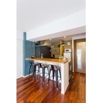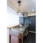 ステンレスのキッチンと造作の木製カウンター、タイルなど、異素材を組み合わせたモダンなキッチンとなりました。