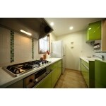 (旧東京ガスリモデリング株式会社での事例です。)鮮やかなグリーンを用いたキッチンは、シンクとガスコンロをセパレート型にすることでリビング・ダイニングと対面になり、コミュニケーションが図れる間取りに。空間のアクセントになるようガラスタイルをご提案しました。