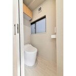 トイレスペースを広く取るためタンクレストイレを提案。 上部空間に合わせて吊戸棚を設置したことで収納効率がアップします。