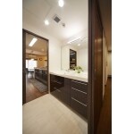リビングに落ち着いた雰囲気がほしいとのご要望をいただき、カーペットから木の質感が美しいブラックウォールナット色のフローリングにリフォームしました。 落ち着いた色合いと木目が、高級感漂う洗練された空間を演出してくれます。 テレビ周辺の収納棚は、AV機器などを使いやすく収納することができるよう、細かいところまでお打合せを重ねました。 重厚感のある色で統一しているので、圧迫感が出ないよう間接照明やガラスブロックを用いて、リラックスできる空間作りを目指しました。 夜になると、間接照明による暖かみのある灯りが大人な雰囲気を醸し出し、ご夫婦の趣味であるワインを楽しめる最高な空間になったとご満足頂きました。