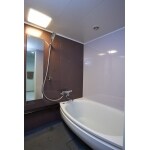 (旧東京ガスリモデリング株式会社での事例です。)梁スペースを取り込んで1418にサイズアップしました。壁のアクセントが個性的な浴室空間です。