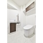 出来るだけスペースを広く取れるようトイレの位置を変更。 さらにタンクレストイレを採用することで、より広い空間が確保できました。白を基調として清潔感のあるトイレスペースを提案。ポイントとして吊戸棚の扉や収納の扉をブラウンにしたことで空間が引き締められました。