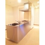 ステンレスキッチンで、ペニンシュラ型にしたい。レンジフードは既存利用して、コストはできる限り抑えたい。ガスコンロのところは油や煙の流出を抑えたい。