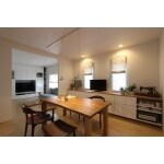 ダイニングには、壁面にローボードを設置。床から少し浮かせることによって、あしをいれられ使い勝手がよい。収納が豊富にあることによって、テーブルがいつもきれいな状態にたもてる。電話やプリンターは、オープン収納としている。TVやインターネットなどのモデム機器も収納のなかにおさめている。