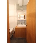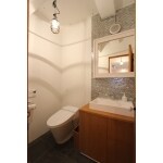 壁にモザイクタイルを貼った造作洗面台とタンクレストイレ、床に貼った濃い色のタイルも洗面台とトイレをひき立てている。