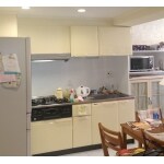 タカラスタンダードの明るいライトイエローのシステムキッチンにお取替え。空間全体が明るくなりました。