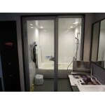 マンションという限られた空間の中で、バスルーム、洗面室、トイレを壁で区切ると、扉の開閉などもあり広い空間の確保が難しくなりますので、ホテルにあるように洗面室とトイレを同一空間とする提案をさせていただきました。また、マンションのバスルームには窓がありませんので、ダウンライトLED照明を増やして設置することにより、休日の日中に入浴される違和感を解消しました。なんと言っても、バスルームと洗面室を区切る大型透明FIX窓が広がりのある空間を演出していますので、別世界のようです。更に、電気温水器を追い炊き機能のあるエコキュートに交換しましたので、お湯の無駄をなくし、自動お湯はり機能も装備しておりますので効率的となり電気代の節約にも貢献することができました。