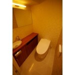 トイレとは思えないラグジュアリーな空間。 全体を引き締める木目の造作カウンターに、丸みを帯びたフォルムが可愛らしいセラトレーディングの手洗器。 壁面の一面には光沢のあるモザイクタイルを施し、他三面はジャボン玉のような柄クロスを組み合わせ、小スペースながら、贅沢な空間ができました。
