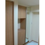 玄関土間脇の半分は靴箱収納部として、もう半分は生活用品等の収納場所として作り直しました。両方とも押入れほどの奥行は必要としないので、その分玄関土間部や廊下の間口は広がりました。