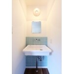 こだわりのつまったオンリーワンの造作洗面。実験室のシンクを思わせるような手洗いボウルがレトロな雰囲気を演出しています。