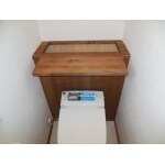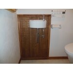 背面収納の右下には開き扉があり 掃除用具等がしまえるようにしました。