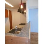 キッチンは既存利用しました。前壁に無垢の杉材を貼ってロハス風に仕上げました。