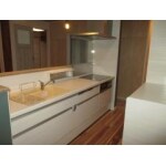 落ち着いてゆっくりと食事を楽めるようにダイニング側のクロスを濃いグリーンにしあげました。 調理して直ぐに配膳片付けもスムーズです。照明にもこだわりました。