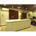 キッチンは白一色で清潔さを出し、お料理をしながらもご家族やお客様とお話ができるように独立アイランド型でご提案させて頂きました。 幅広のキッチンカウンターをチョイスし、お料理の盛り付けスペースを確保。また、キッチンカウンター前面の収納は細々したものを収納するのに大変便利です。