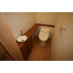 最新のタンクレストイレを導入。 木製の手洗いカウンター・収納を造作、床には無垢フロアーを使用して、ナチュラルな空間に仕上がりました
