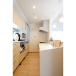 壁付けのキッチンを対面式に変更。収納不足を解消するために壁一面に収納棚を設置しました。