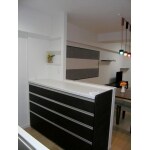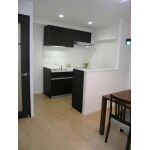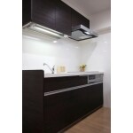キッチンは間仕切りのように天井まで高さのあるカップボードを撤去し、カウンタータイプのキャビネットを設置。リビングとの視界を遮らず、空間の広さとつながりが出るようにしました。 高さが99cmのハイカウンターキャビネットはリビングから見た時、手元から下は見えませんが、視界は遮らないので、空間に圧迫感が出ません。更に、50㎝程度の袖壁を作り、電子レンジなどの家電がダイニング側から見えないようにしました。 システムキッチンを交換し、フローリングをリビングから一続きに貼替ました。