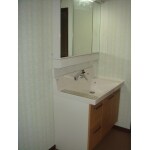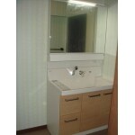 コンパクトですが、3面鏡で収納力のある引出しと開き扉併用タイプをご提案致しました。洗濯機の位置を変えて広々とした洗面・脱衣所とまりました。