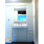 本体は、引き出しと扉収納で分別して収納可能。また、収納力を増やすのに、トールキャビネットを追加しています。