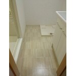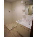 洗面脱衣所兼洗濯スペース。コンパクトながら広々とお使い頂ける洗面化粧台です。