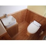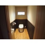 1階トイレ、腰壁の落ち着いた色合いでシックな仕上がりとなりました。