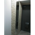 玄関の壁にデザインタイルを施工。エコカラット ランド<土もの調>。天井からの照明できれいな影を落としています。