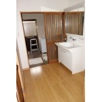 壁・天井のクロスを新設。 床をフロア張りに変更し、トイレ・キッチンの床とフラットに。 洗面台を新設。