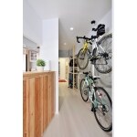 趣味の自転車を置けるスペースと天井・床のポール補強、そしてキッチンの対面無垢カウンターで部屋にアクセントをつけました。
