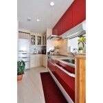 キッチンはステンレスの高級感・光沢感をふんだんに取り入れました。 奥の食器棚と冷蔵庫置き場は既存を利用し、塗装色を明るくしました。