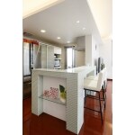 キッチンカウンターを広げて、カウンターでもお食事ができるようになりました。カウンターを造作するだけではなく、お客様のお好みのテイストのガラスモザイクタイルをご提案。割り付けや目地の本数などをすべて図面におとして設計しました。