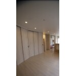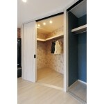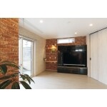 リビングの変形空間を利用し、大きなウォークインクロゼットを設置しました。またTVボード左には飾り棚をプラン。壁のブラケットライトもアクセントになっています。