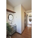 使っていなかった玄関横の6畳間とつなげて広々とした玄関ホールに、トイレと手洗いを新設しました。 子世帯の洗面所は2階にありますが、これで帰ってすぐに手洗いうがいができます。 ステンドグラスが玄関に華やかさを、階段室に明かりをもたらします。