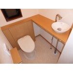 便器の片側に収納棚が設置されていました。便器はタンク器に手洗い機能付きのものを使用していたため、導入するものは手洗い器を便器から離れたところに新設するものになりました。