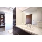 W1200の洗面化粧台を設置。広い洗面空間になり、室内物干しも可能です。