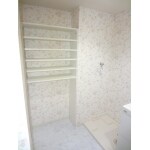 収納に配慮した洗面空間。浴室に隣接しカビ対策として天井材に調湿材も施しています。