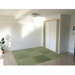 自然の光と白を基調とした明るく広いLDK、そこにキッチンとアクセント貼りのクロスの色が引き締めます。