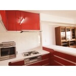【ダイニングスペース収納】ダイニング側のカップボードの扉柄は、あえて、既存の家具と馴染むよう落ち着いた色目に。赤と茶のコントラストが綺麗です。