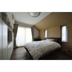 勾配天井をバイカラーで分けたご夫婦の寝室です。刷毛引きの侘びた琥珀色は珪藻土。天井は塗り壁調のエコクロスです。フロアはホワイトアッシュ材を既存に上張りしました。