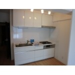 収納力抜群のフルスライドタイプのキッチンです。照明にスポットライトを使用しました。