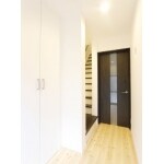 (旧株式会社ハウスドゥでの事例です。)白い壁や天井、木材の温かい床により、明るい空間に。 土間部分を狭め、廊下の位置を寄せ、LDKのスペースを広くとるようご提案。 LDK⇔廊下に扉を新設することで、来客時も慌てず生活感を隠せます。