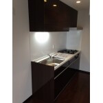 最低限の賃貸向けキッチンの機能プラス、キャビネットは引き出しタイプにし、デザイン面では、レンジフードを薄型フードで清掃性も良いもの、ワークトップは人工大理石でご提案しました。手元灯の他に天井面はダウンライトで配灯しております。